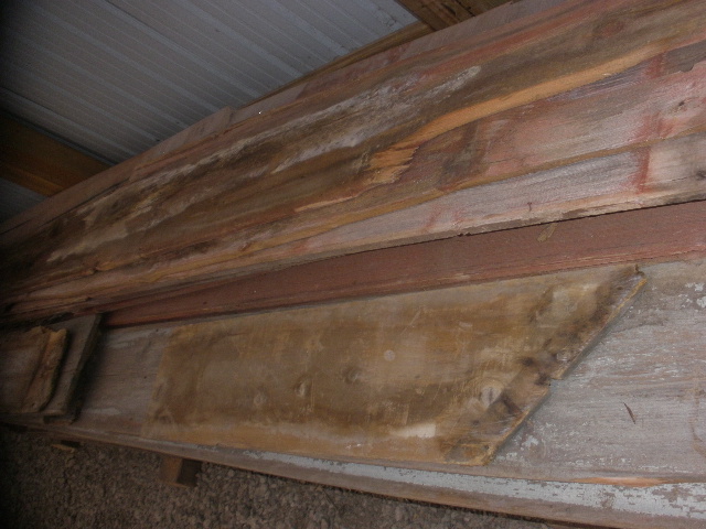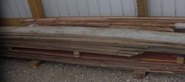12″ wide vertical barn siding — some with various degrees of red paint, some with various degrees of grey paint.