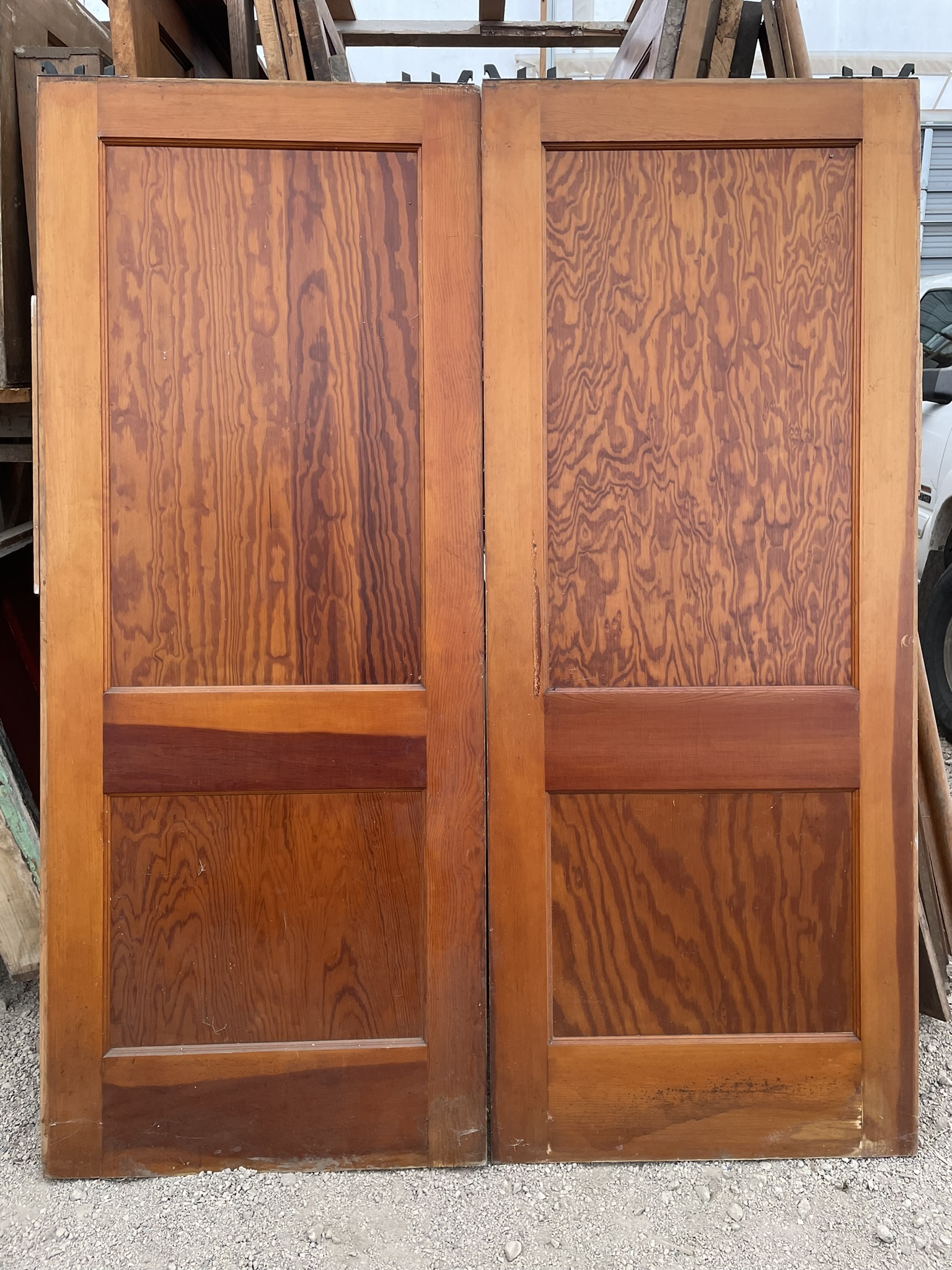 A pine pocket door pair with a great finish. They really evoke a sense of early 1900s homeliness, and would look wonderful in any period home. Each door is 32″ w x 79 1/2″ h x 1 3/8″ d. Pocket door rails and rollers not included.