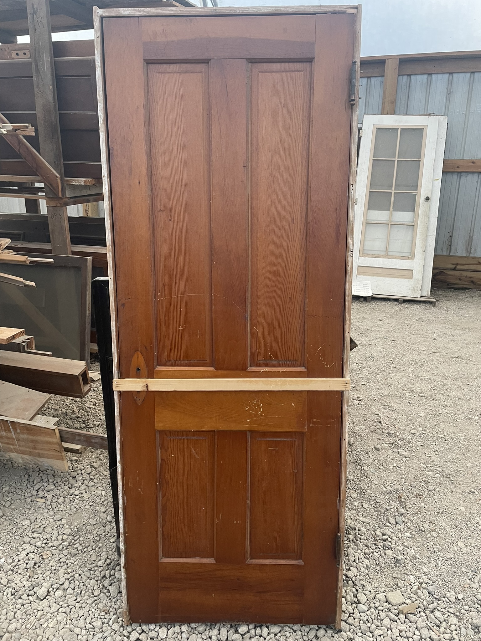 Four panel door in a nice, darker pine in great condition. Includes the door jamb. The door is 28″ w x 76″ h.