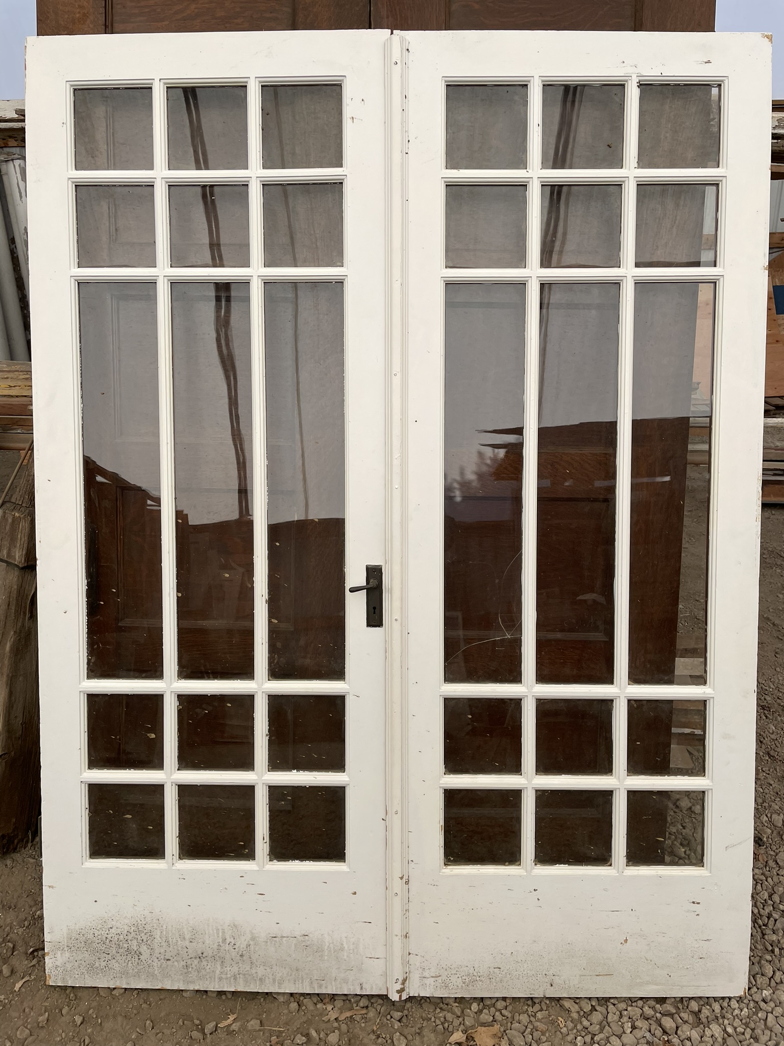 Beautiful prairie style French doors with original hardware and in good condition. Both pairs are 60″ w x 79″ h x 1 3/4″ d. One pair has a cracked pane and the other pair has a missing pane.