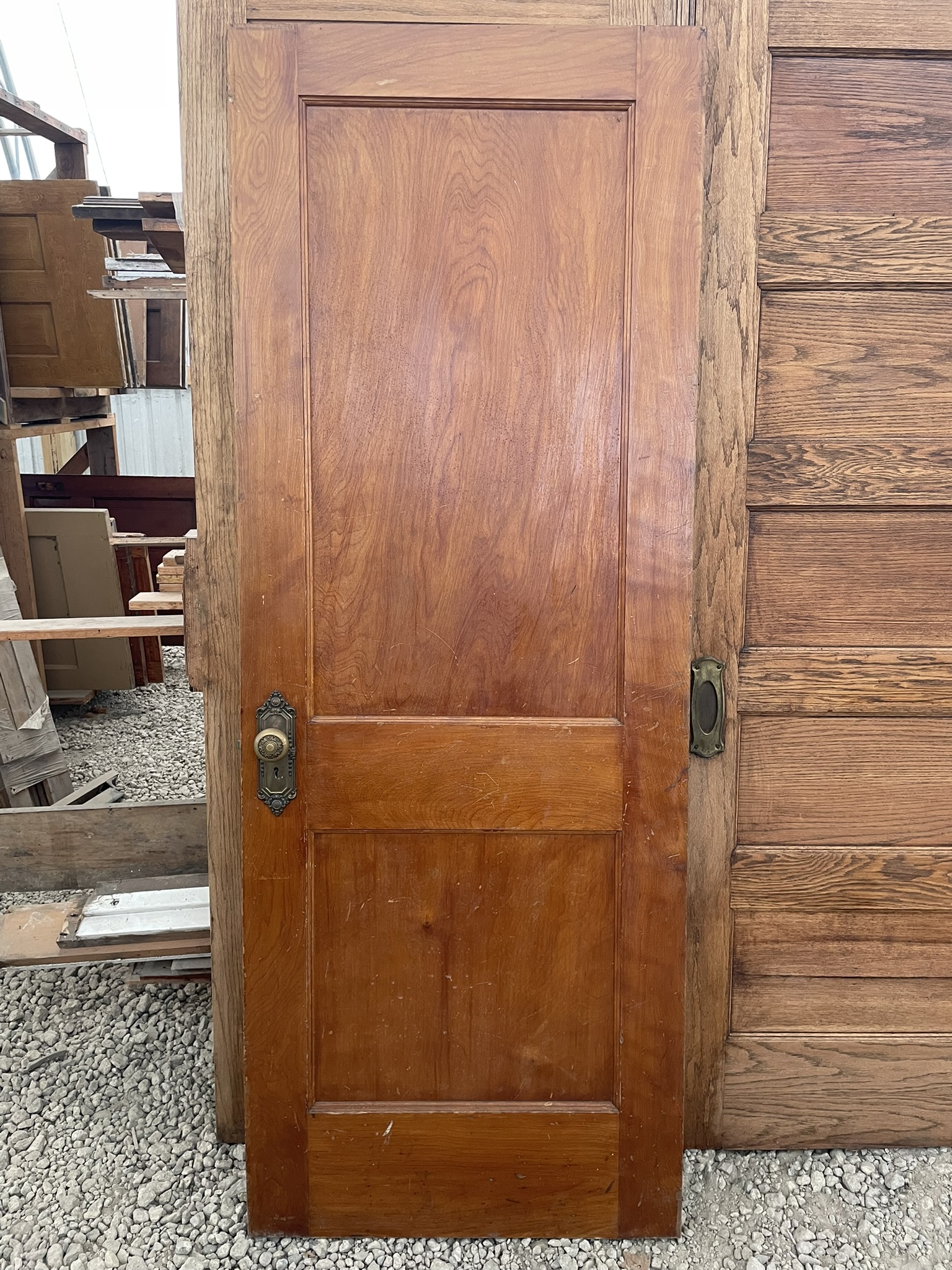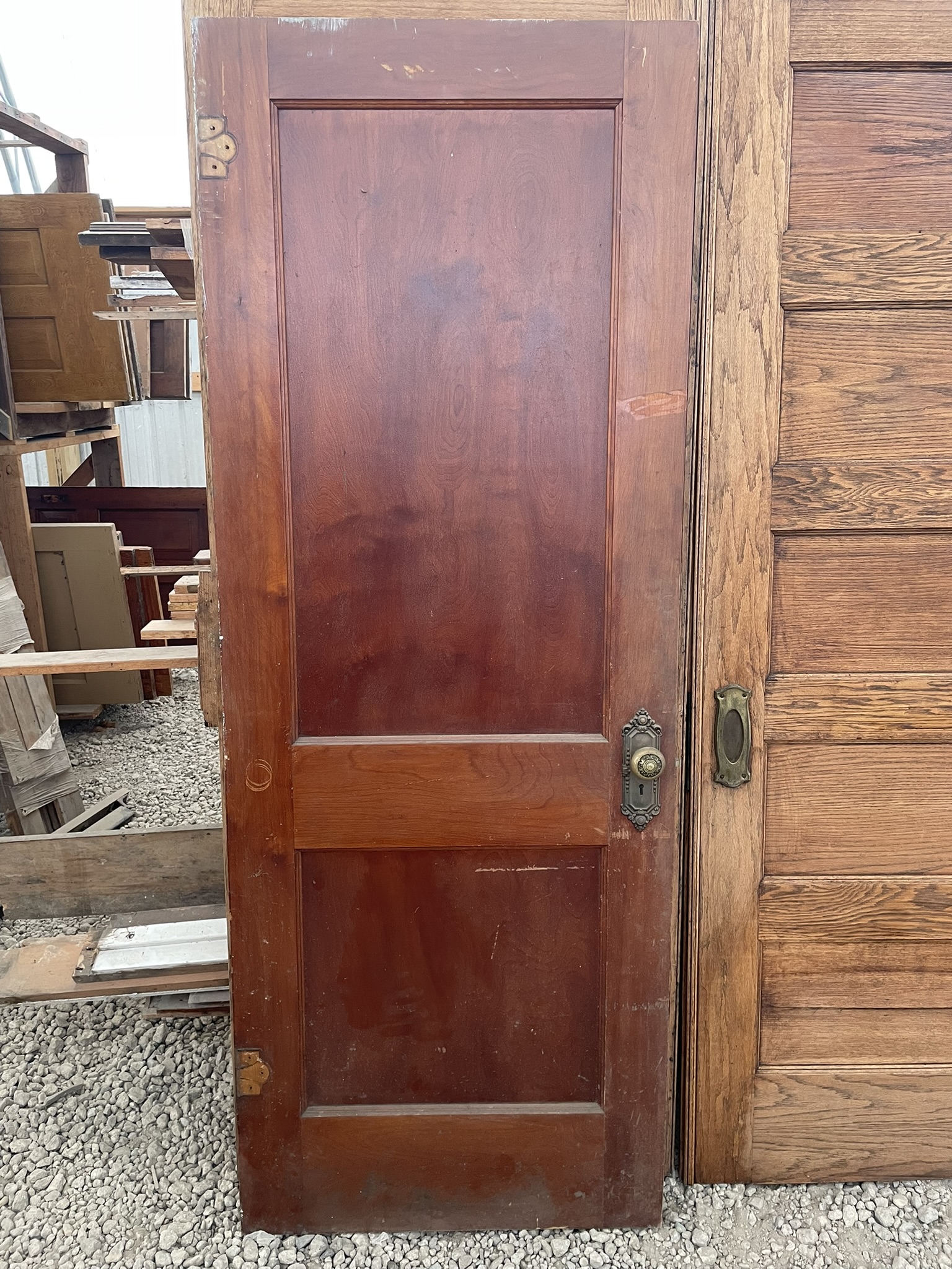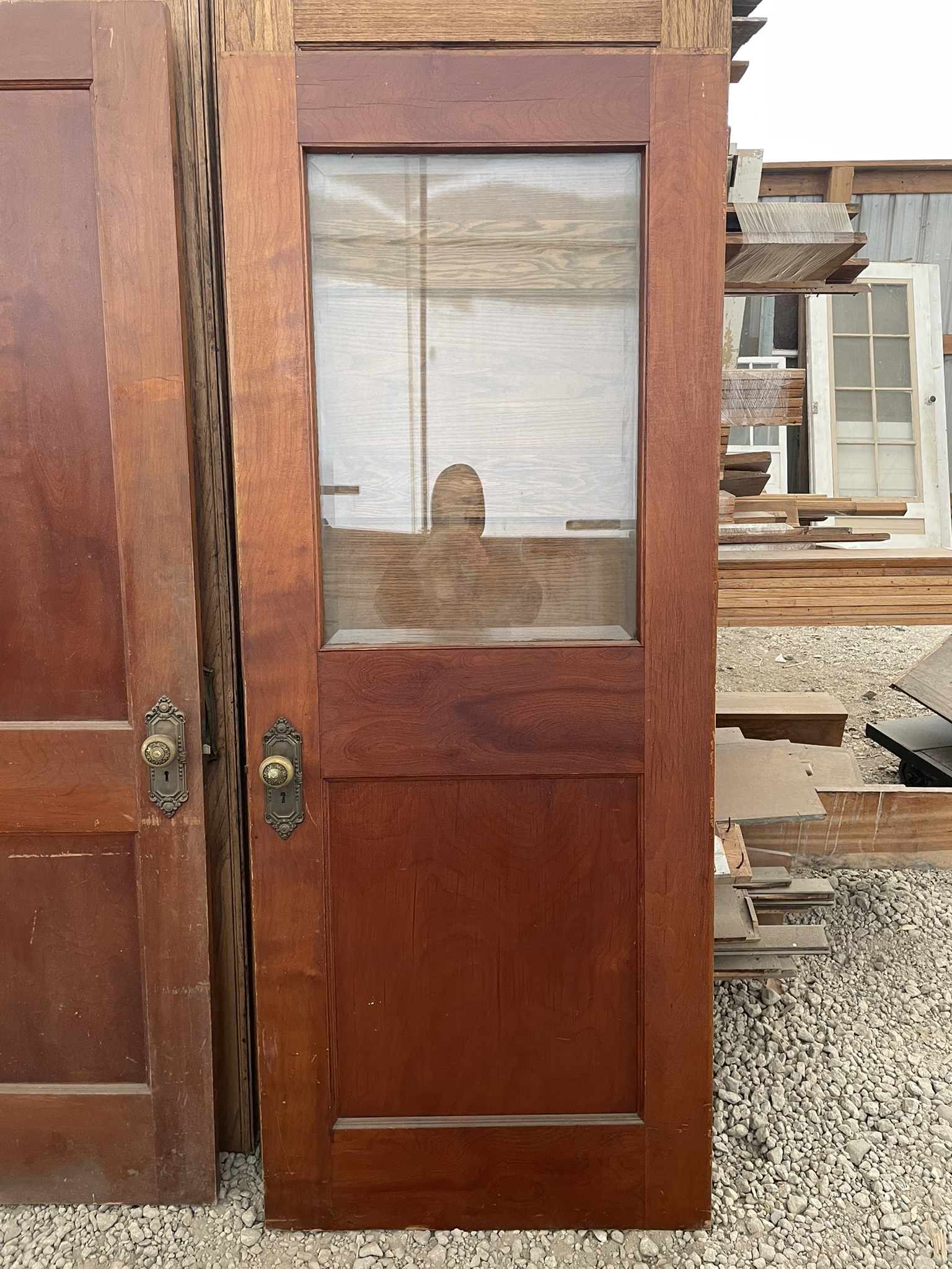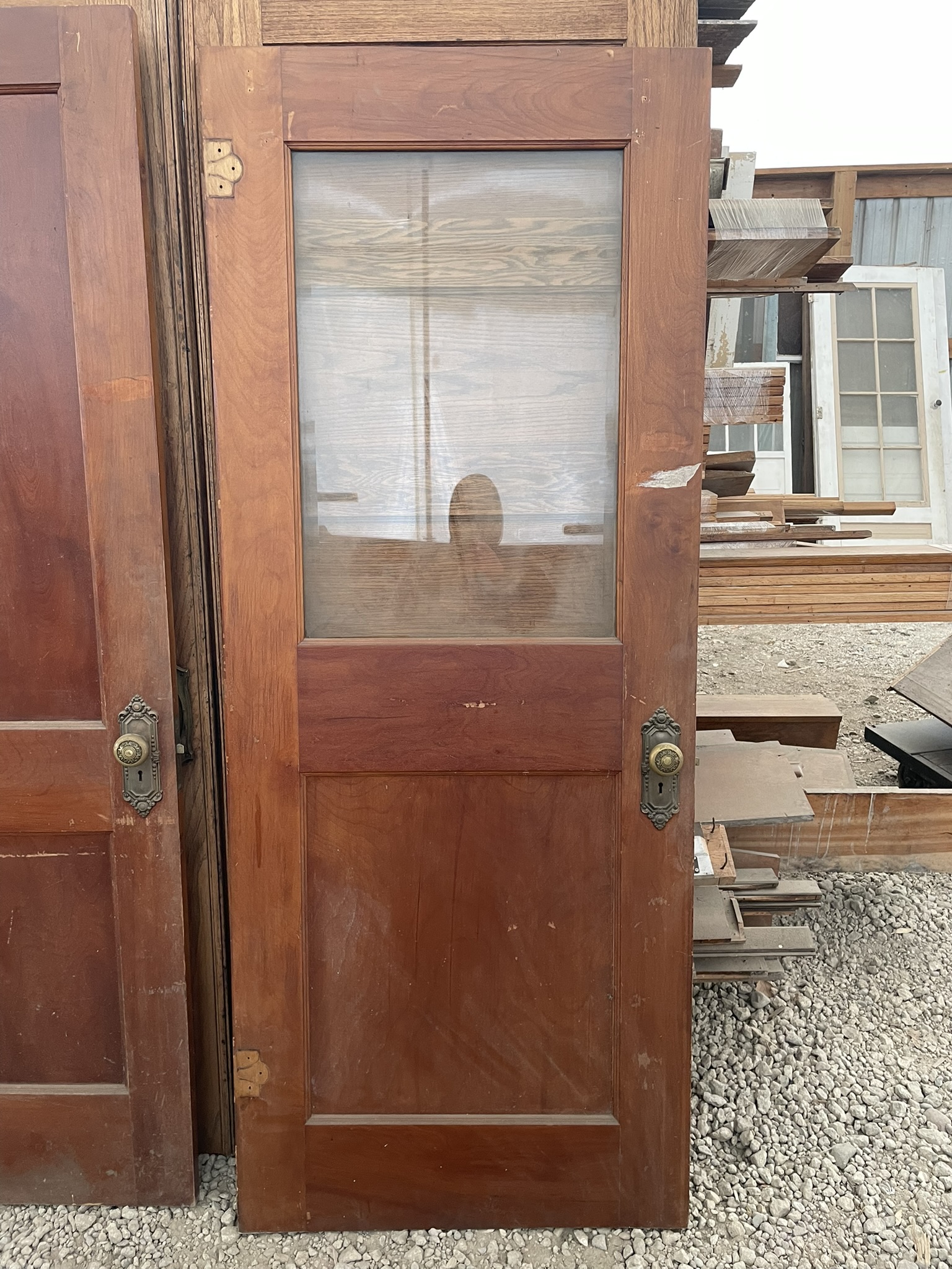 Two matching pine doors, one in a two-panel style , one with beveled glass and one panel.